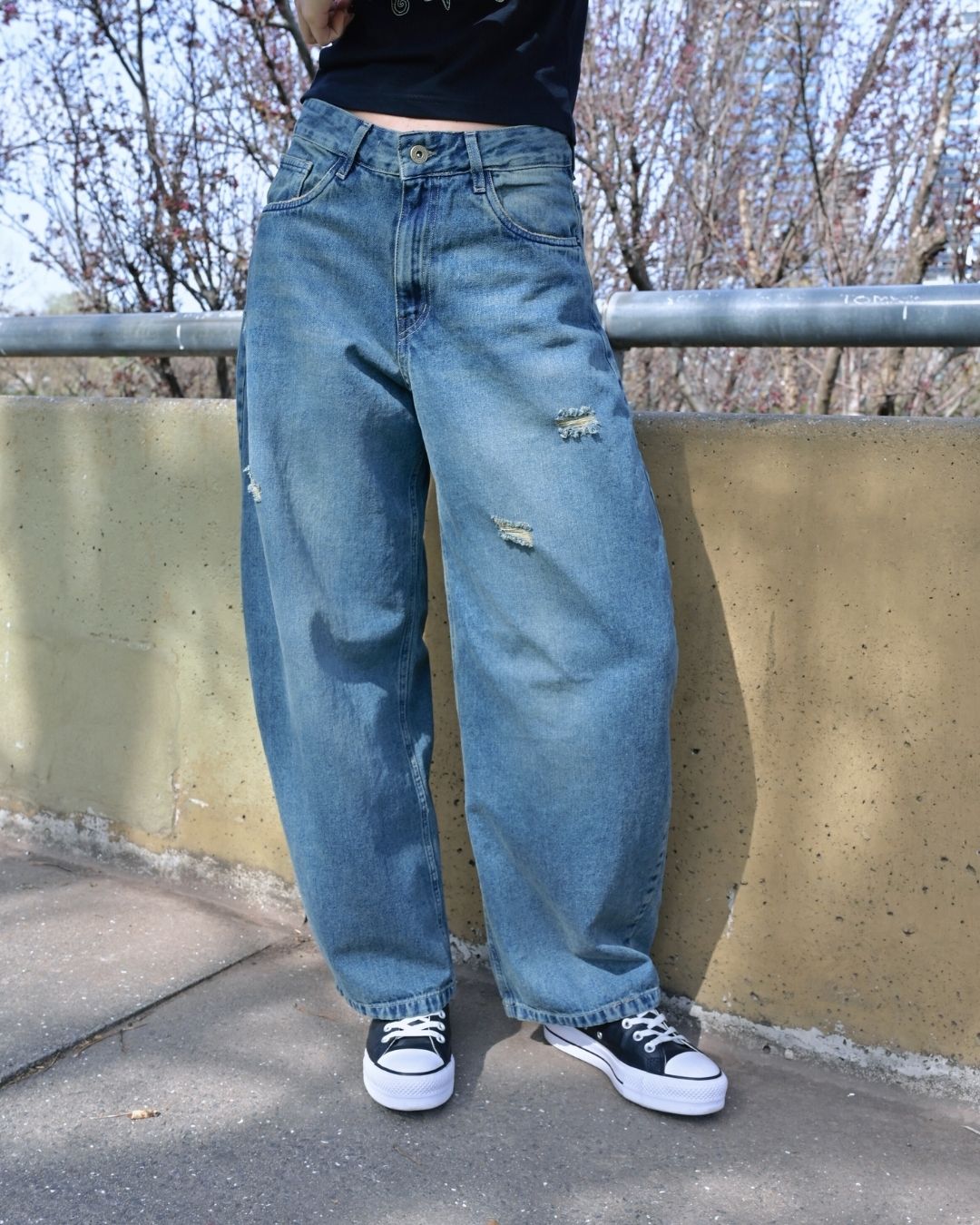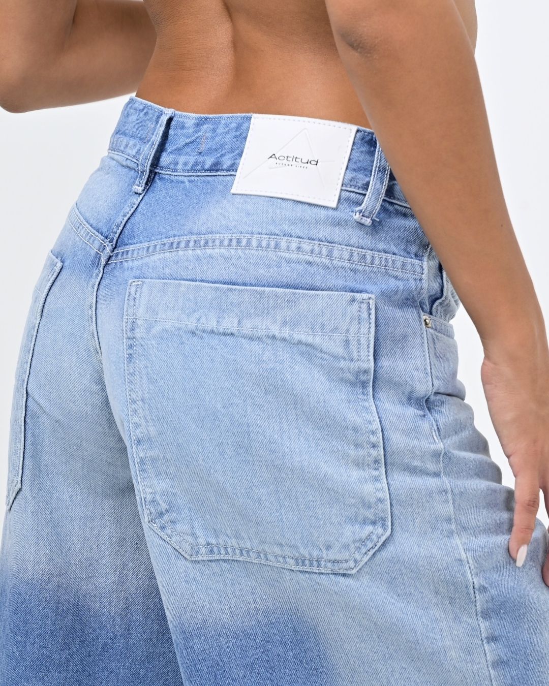 🔘DETALLE – tiro medio – lavado con desgaste, bigotes – cinco bolsillos