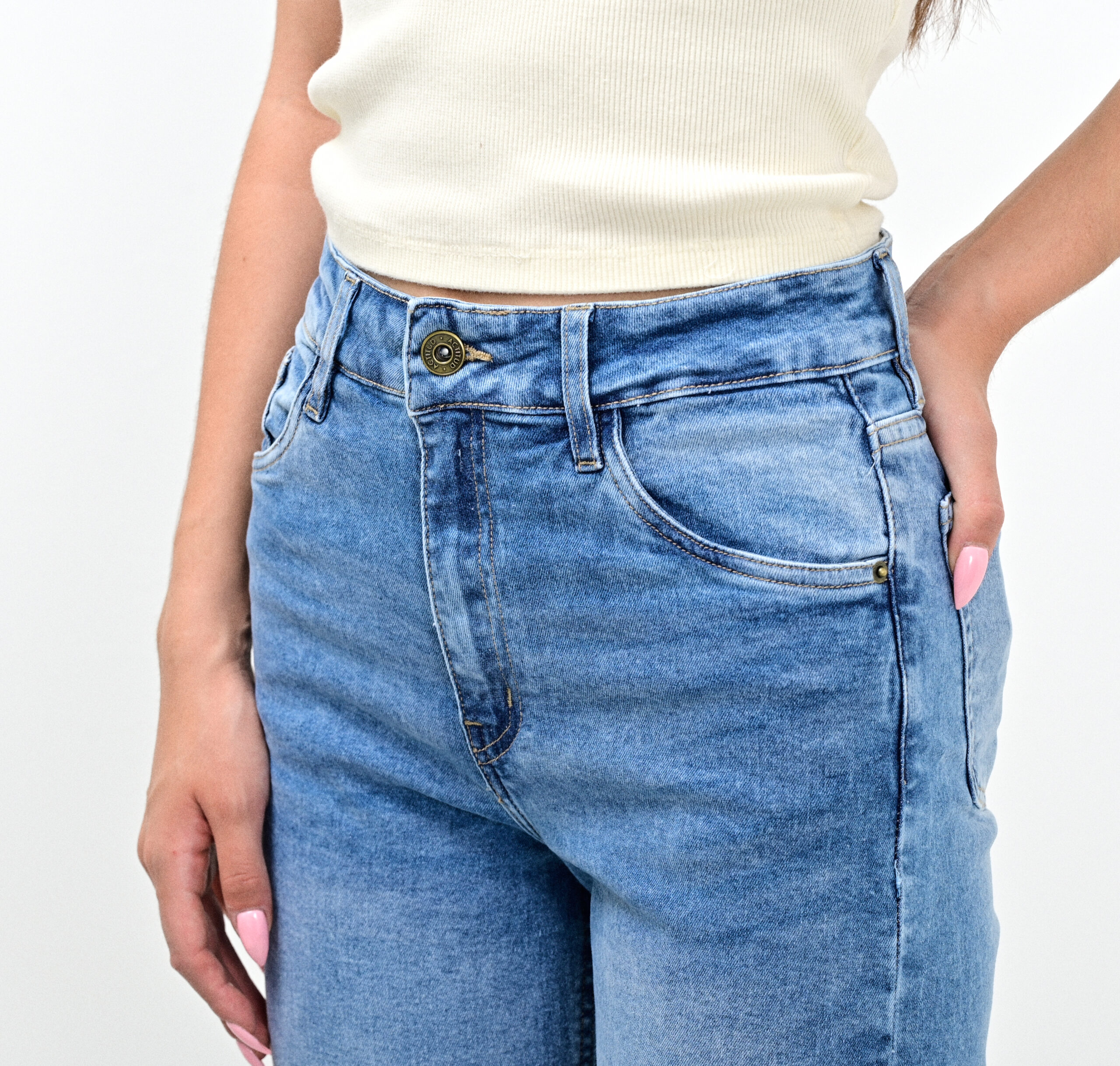 🔘DETALLE – tiro alto – lavado con desgaste, bigotes – cinco bolsillos