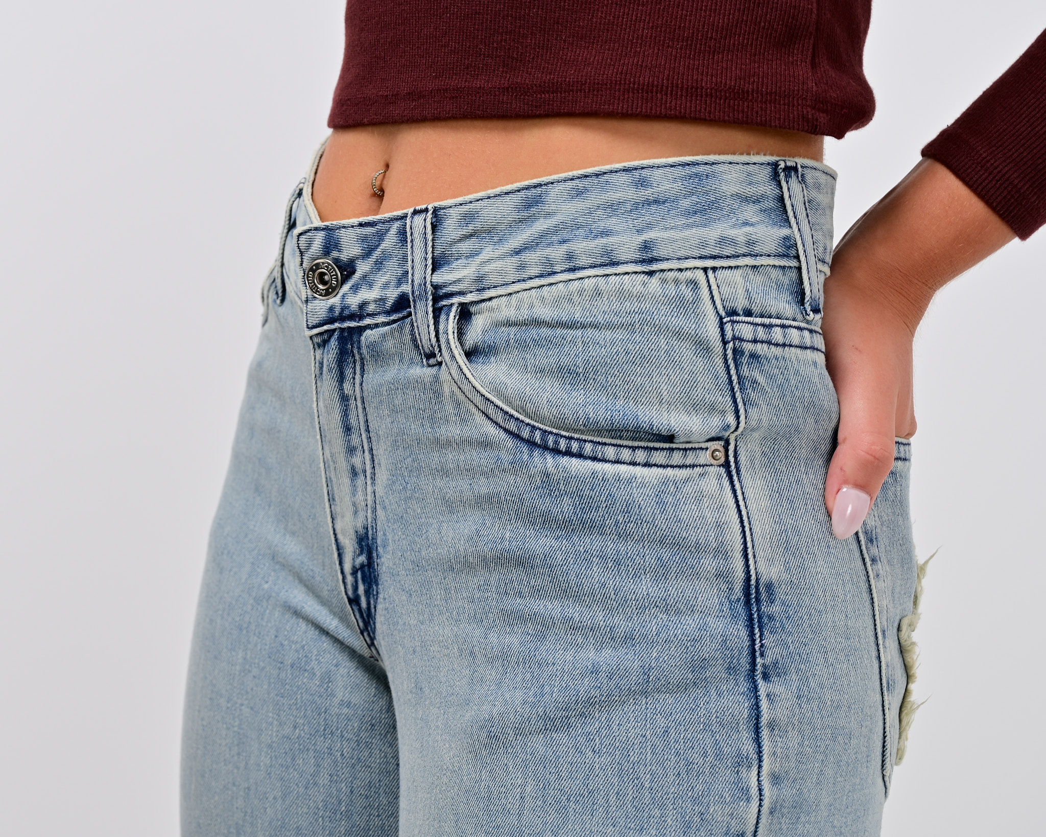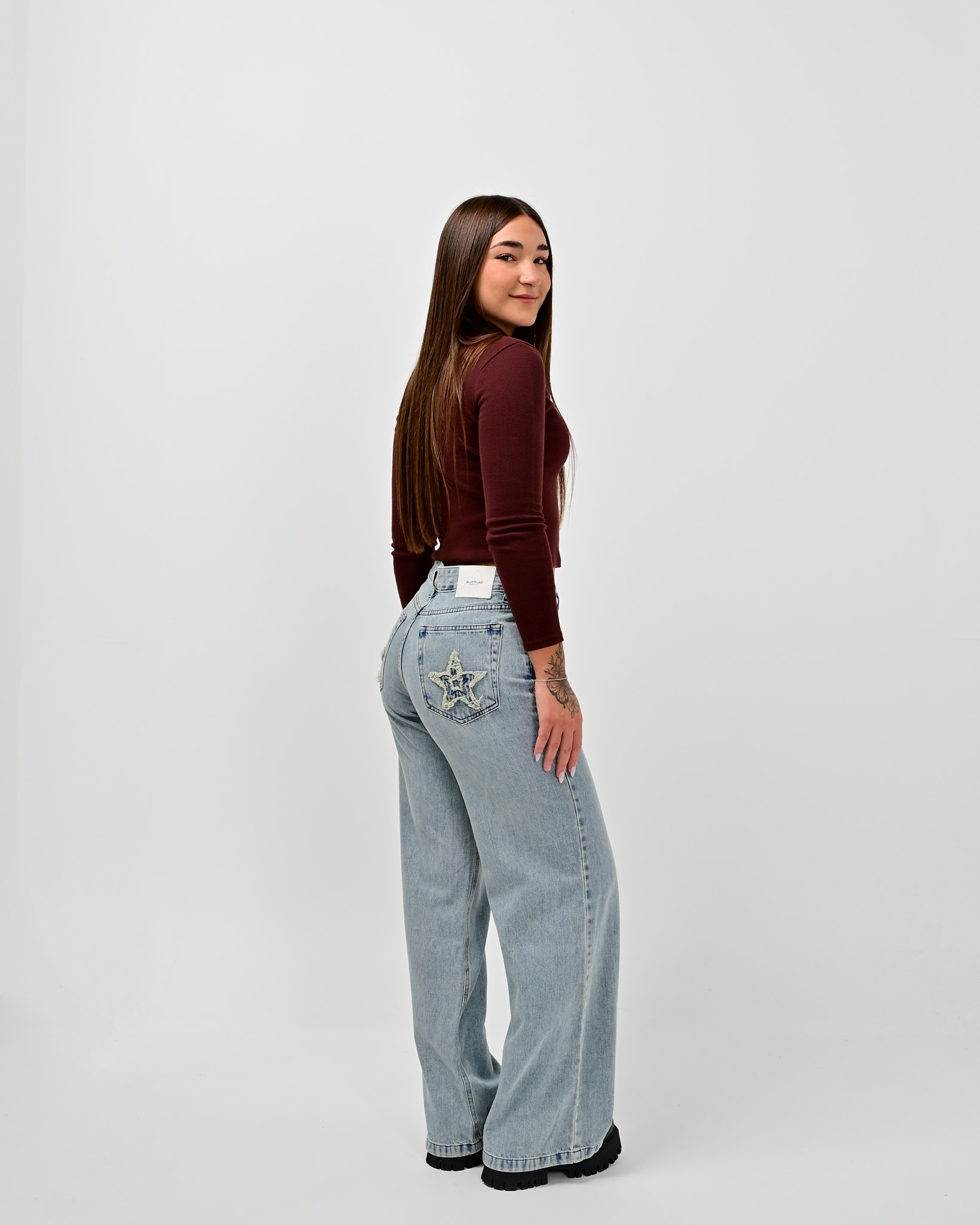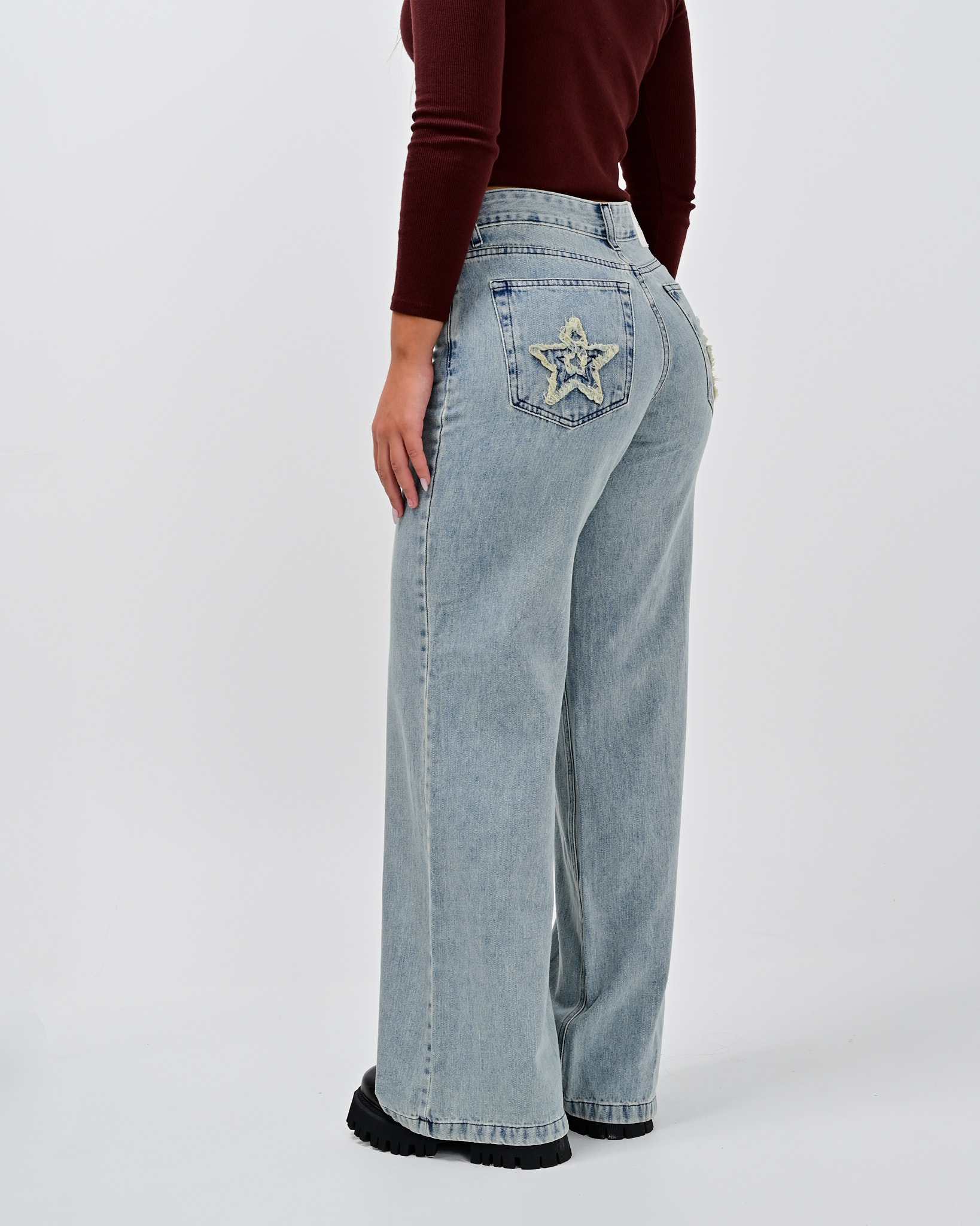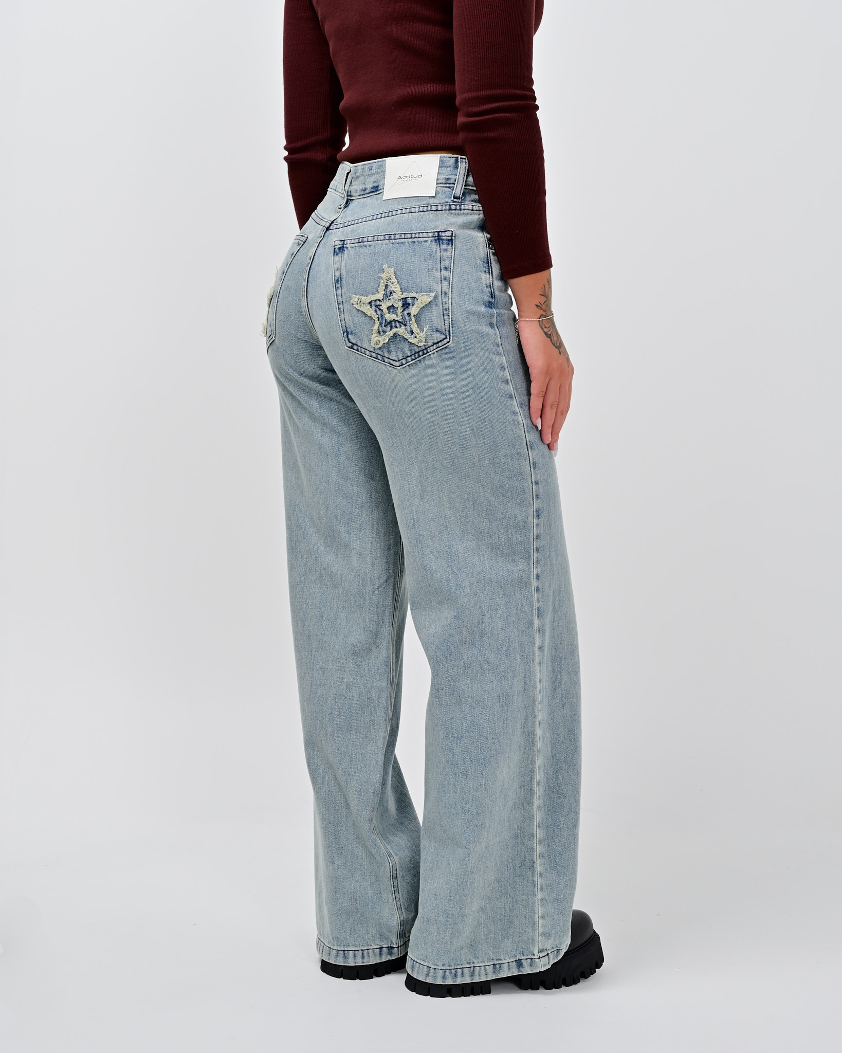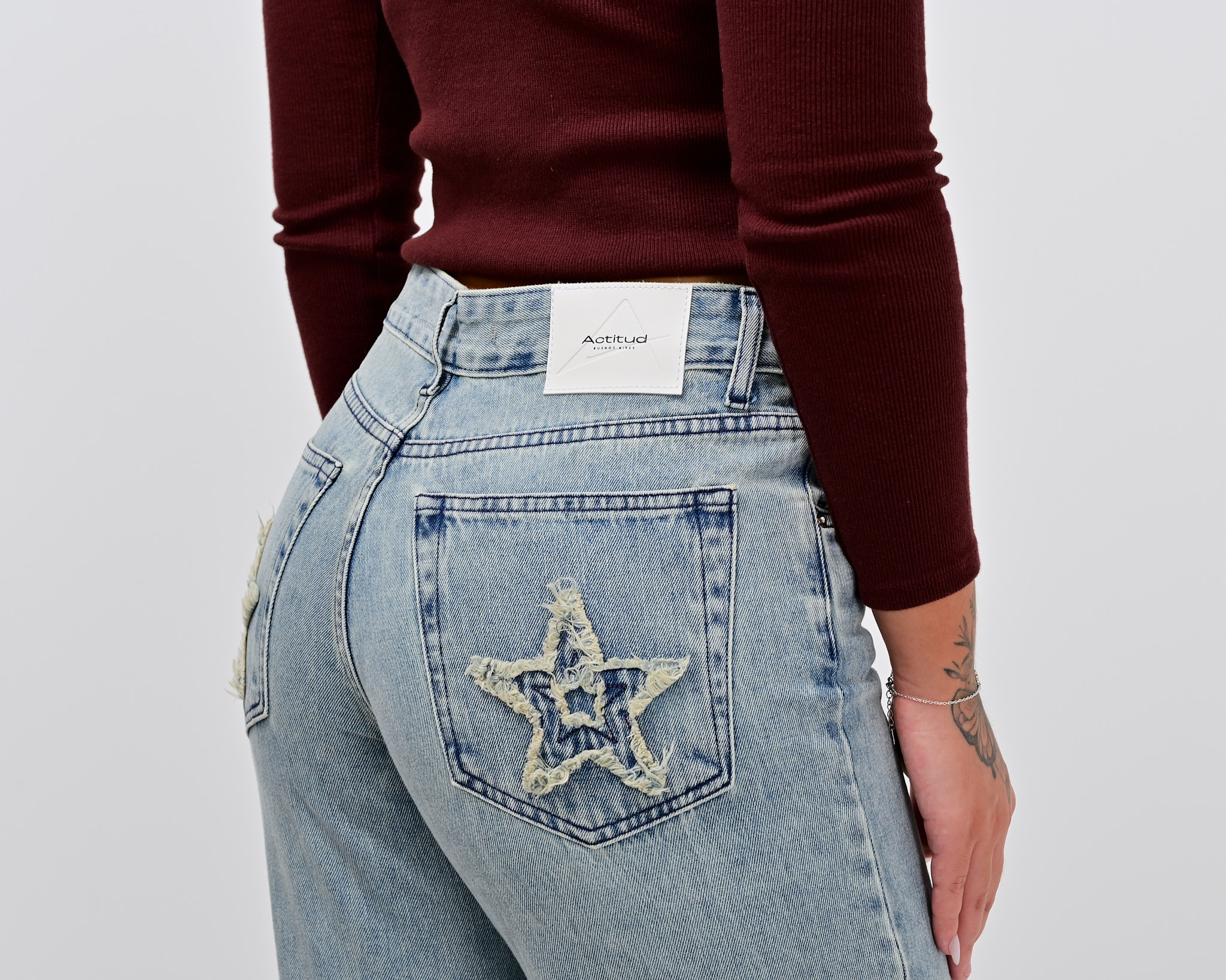 🔘DETALLE – con parche de estrella en los bolsillos traseros, tiro bajo, lavado con desgaste – cinco bolsillos